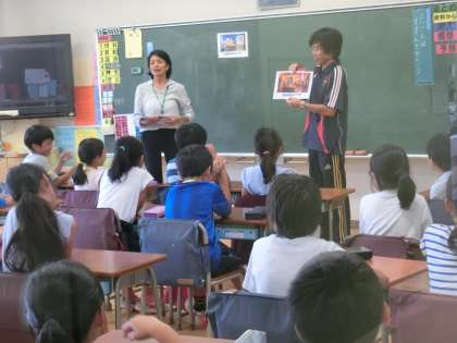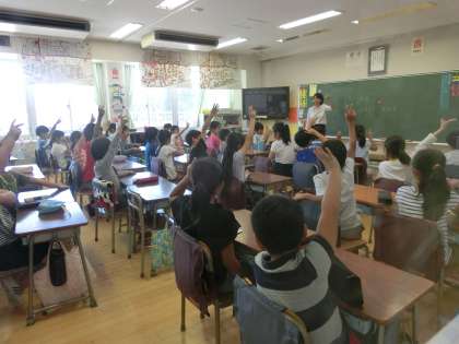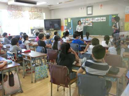 9月14日(木)からALTによる授業が再開しました。21日(木)は2回目です。ALTによる授業は1年生から4年生までに行われています。毎時間、職員室に日直や係りの子どもたちが先生を迎えに来ますが、ちょっと照れくさそうにする姿もあります。3年生は、建物(学校、警察、病院、郵便局など)の言い方を学習していました。写真は3組の様子です。