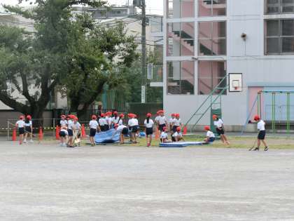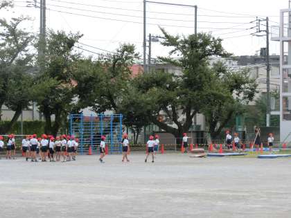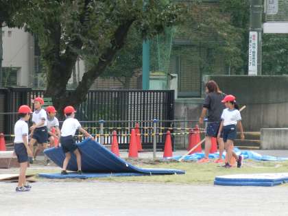 4年生は体育の時間に「走り幅跳び」の練習をしています。体育倉庫からマットや跳び箱などを運び、準備を行っていました。助走のあと、しっかり地面を蹴って高く遠くに着地できるように何度も練習をしていました。写真は、3組の様子です。