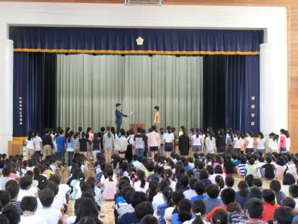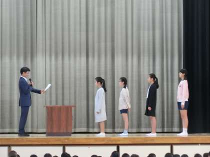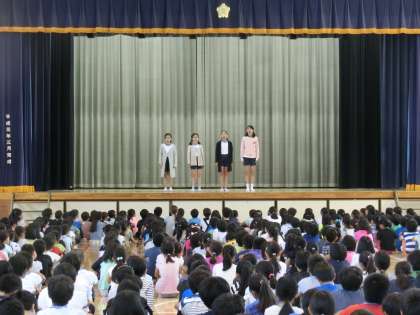 10日(火)は体育館で全校朝会を行いました。その中で合唱団の表彰をしました。9月に行われた「TBSこども音楽コンクール」に2部門(合唱の部、重唱の部)で参加し、どちらも優秀賞を受賞しました。特に重唱の部は、最優秀校として東日本優秀演奏発表会への出場が決定しています。賞状を受け取ったあと、6年生女子4人による重唱が披露されました。美しい響きに聴いているみんなが感動しました。