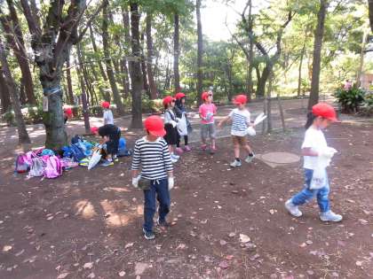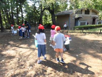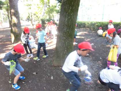 10日(火)、1年生は生活科の授業で「あきさがし」に羽根木公園まで出かけました。久しぶりの夏日となりましたが、赤白帽子を被り、水筒を持って元気に学校を出発しました。公園に着くと軍手をして、みんなで秋を探しました。形の違うどんぐりや色のきれいな落ち葉などをビニール袋にたくさん集めていました。公園を管理する方は、子どもたちのために、落ち葉掃きをせず待ってくださっていました。地域の方のやさしい心遣いに感謝の気持ちをもちました。