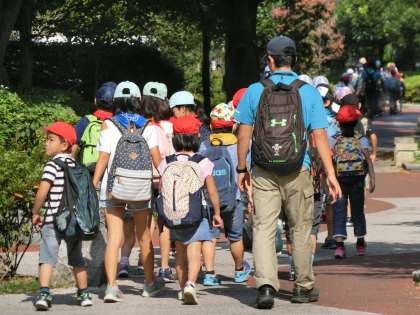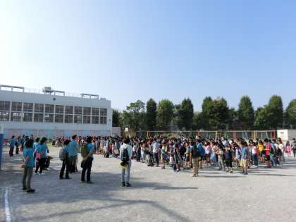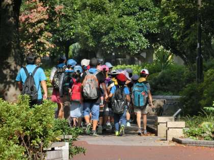 12日(木)の午前8時40分、校庭に全校児童が集まりました。校外たてわり活動に出かける前に、出発式を行いました。校長先生のお話、約束の確認のあと、2分間隔で目的地の蘆花恒春園に出発しました。Bコースを歩く10班から18班は、緑道入口を9時30分までに次々と通過していきました。10時30分から午前の遊びを開始したと連絡がありました。