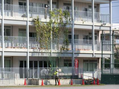 子どもたちが校外たてわり活動に出発した校庭では、みどりのカーテンの取り外し作業が行われました。5月に苗を植えてからどんどん大きくなり、校舎3階のベランダにまで到達したみどりの葉も実も本日をもって片付けられました。写真の3枚目は、9月に撮影したものです。