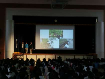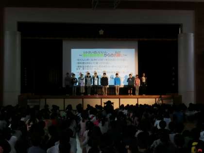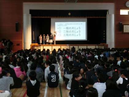 19日(木)は体育館で委員会発表を行いました。今回も2つの委員会の活動の様子を発表しました。最初は、理科・栽培委員会でした。学校を花でいっぱいにしようと自分たちでたねや苗を植えたり、芝刈りをしたりしています。今回は、クイズを2問取り入れて全校のみんなに興味をもってもらおうとしていました。