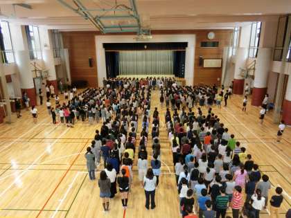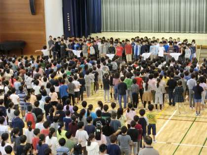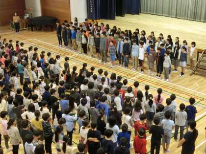 23日(月)、台風21号の接近・通過に伴い天候が心配されましたが、午前7時に暴風警報が発令されていないため、本日は通常の授業を実施しました。朝は体育館で全校朝会を行いました。その中で、25日(水)に連合運動会に参加する6年生に向けて1年生から5年生までが大きな声でエールを送りました。5年生が応援団を組織し、給食の時間に各教室を回って応援の練習をしてきました。体育着を着た5年生応援団が、きびきびとかっこよく応援をしました。応援のあと、6年生からは「頑張ります。」という決意と「今まで朝遊びを我慢してくれてありがとう。練習に付き合ってくださってありがとうございました。」というお礼の言葉がありました。