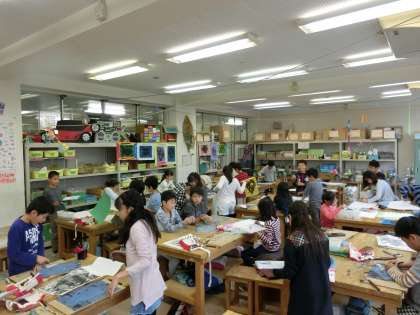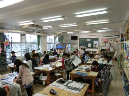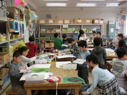 11月の学習発表会に向けて、どの学年も作品づくりに一生懸命に取り組んでいます。4年生は「線 de マスク」と題した作品の仕上げにかかっていました。彫刻刀で彫ったところにインクをつけ、バレンでこすったり、画用紙に色を付けたりしていました。学習発表会は11月24日(金)と25日(土)に行われます。写真は、1組の様子です。