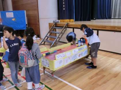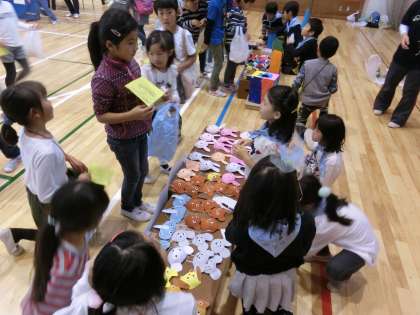 どのお店も行列ができていました。お店の名前も凝っています。写真上から「楽しい楽しいおめんやん」「にじいろひこうきとばしゲーム」「ビリヤードボーリング ポン・ヒューパタン」です。