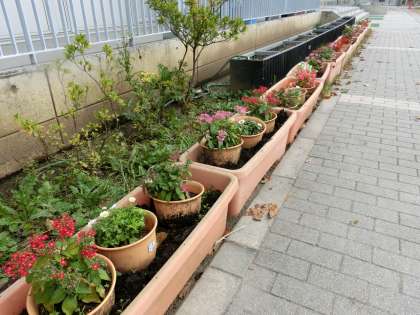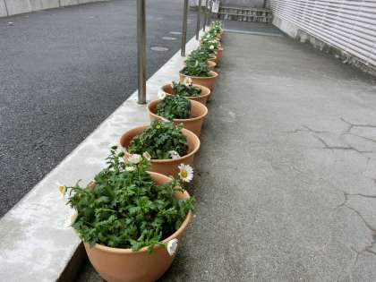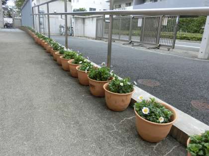 30日(月)の6時間目は、委員会活動を行いました。その中で、理科・栽培委員の5・6年生は、ノースポールの花植え作業に取り組んでいました。鉢に一株ずつ植え、通用口のスロープを中心に飾りました。来校した折にご覧ください。