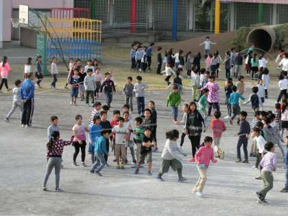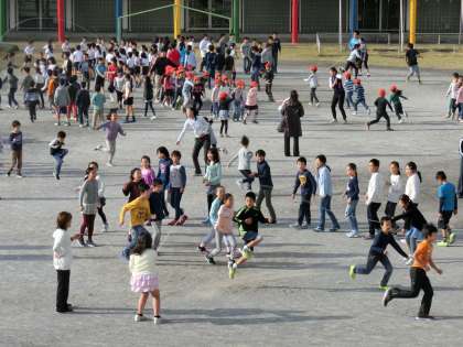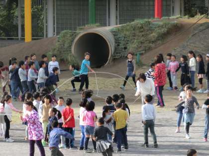 午前8時20分、校庭に全校児童が集合し、長縄跳び計測を行いました。計測時間は3分、3年生以上は子どもたちが縄を回します。校長先生の合図で計測が始まりました。校庭のあちらこちらから「ハイ、ハイ」とリズムをとる声が聞こえてきます。先生たちも応援に力が入ります。見にいらした保護者の方も子どもたちの熱気に感動してくださっていました。