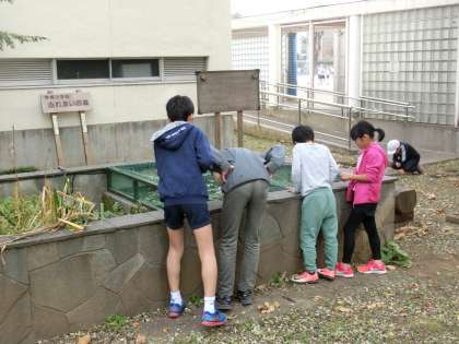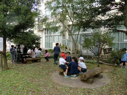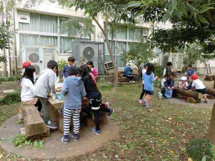10日(金)の中休みは、ビオトープ周辺を開放し、環境委員の5・6年生が活動をしています。今回は、「どんぐりごま」を作っていました。放送を聞いて集まったのは主に低学年でしたが、作ってもらったこまを回して遊んでいました。他にも池の中を見たり、大きな石を動かして虫探しをしたりしている子どもたちもいました。