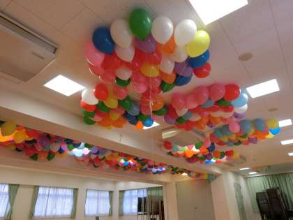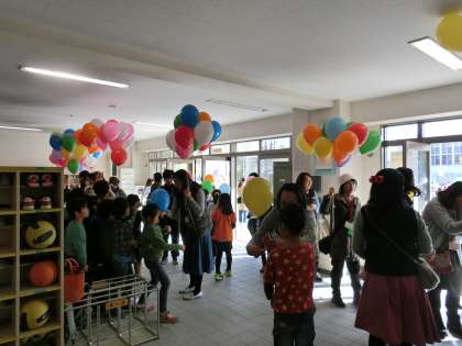 16日(木)の午後、開校65周年を記念して「風船飛ばし」を行いました。風船は、PTAの皆様からのプレゼントです。多目的室にはたくさんの風船が用意されました。昇降口で保護者の皆様が一人ひとりに風船を配ってくださいました。子どもたちは笑顔で風船を受け取っていました。