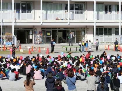風船を持った子どもたちが校庭に集合しました。今回も代表委員が司会・進行を行いました。校長先生のお話のあと、代表委員のコールに続いて午後1時25分に風船を飛ばしました。少し風が吹いていたので南西の方角に飛んでいきました。子どもたちはもちろん見に来てくださった保護者、地域の皆様も手をたたいて一緒に喜んでくださいました。お手伝いをしてくださった保護者の皆様、来校してくださった保護者、地域の皆様方に感謝申し上げます。