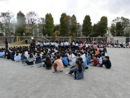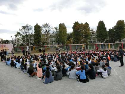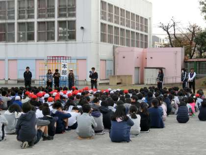 20日(月)の昼休み、避難訓練を行いました。今回は主事室から出火、しかも放送機器が使えない中で火事を知り、避難するという想定です。校庭で遊んでいた子、図書室にいた子、教室にいた子など様々でした。主事さんや先生たちの「火事ですよ。避難してください。」の声掛け、カランカランと鳴らす鐘の音に気付いて避難場所に集まりました。今回も5分以内で避難が完了しました。