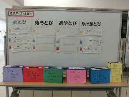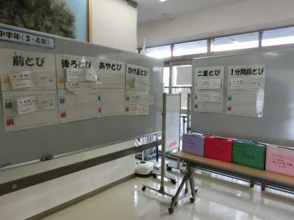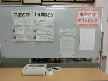 なわとび月間も終盤に近付き、20日(月)から「なわとびオリンピック」が始まりました。低学年、中学年、高学年に分かれて「両足とび」「後ろとび」「二重とび」等の最高記録を掲示します。さらに、給食時の放送で現在の金メダル、銀メダル、銅メダルを発表しています。この取り組みも子どもたちの励みになっています。