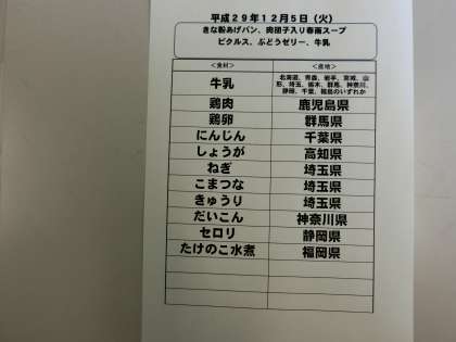 12月5日(火)の給食食材産地について