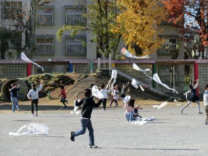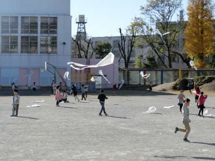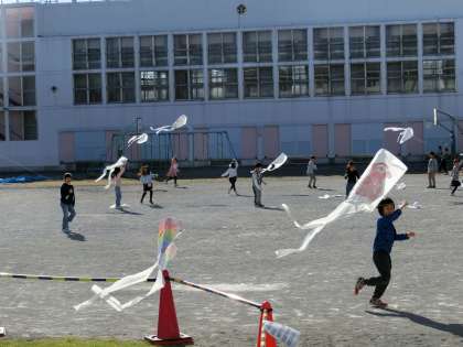 12日(火)、2年生は生活科の学習の一環として「凧揚げ」に挑戦しました。今回は、1組と2組が行いました。各教室で、凧に足を付けたり、絵を描いたりしてから校庭に出ました。凧揚げにちょうどいい風が吹いていて、子どもたちは元気に校庭を走っていました。凧があがると「あがった、あがった。」と嬉しそうでした。