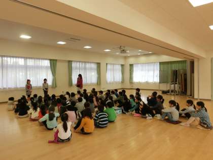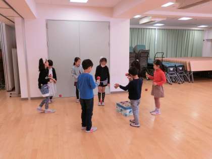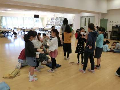 2年1組と2組が校庭で凧揚げをしているとき、2年3組は多目的室にいました。1年3組の子どもたちに6種類の昔遊びを教えていました。はじめの会をしてから、2年生が6つのグループに分かれました。1年生にこつを教えたり、一緒にやってあげたりしていました。終わりの会では、「2年生に教えてもらったからできるようになりました。」という1年生の感想に、2年生はとても嬉しそうにしていました。