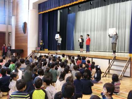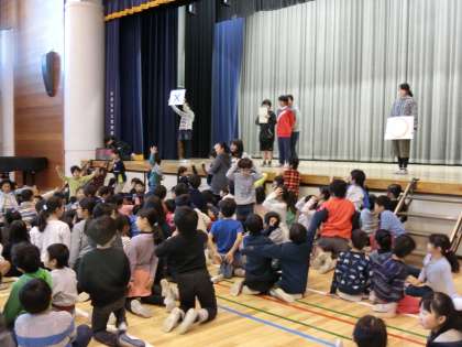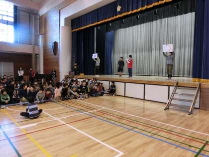 14日(木)の朝は、体育館で児童集会を行いました。5年生が社会科見学に出かけていないため、6年生の集会委員だけで司会進行をしました。今回は、クリスマスにちなんだ○×クイズでした。体育館を縦に二分し、正解だと思う方に移動しました。正解が示されると「イエーイ!」と大喜びする姿がありました。