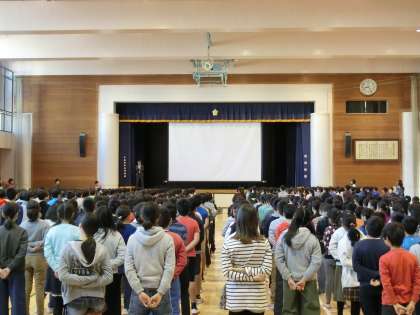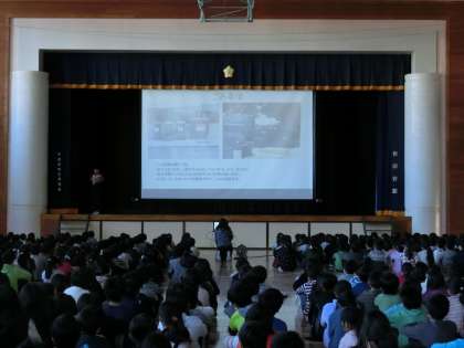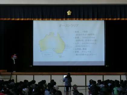 18日(月)の全校朝会は体育館で行いました。今回は、世田谷区小学生海外派遣に参加した5年生の報告会をしました。今年度の海外派遣は、11月にオーストラリアに行きました。現地に9日間滞在し、学校訪問をしたり、固有種の動物と触れ合ったりしたことなどを写真とともに報告しました。約15分間の発表でしたが、会場にいる子どもたちは最後まで静かに聞くことができました。