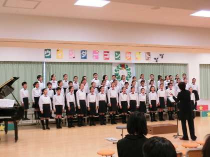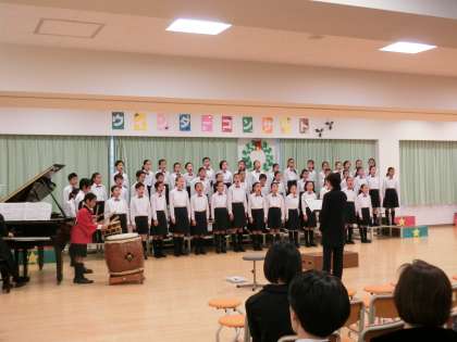 プログラムの最後は、全員合唱「七色の輪の中に」でした。「ハヤブサの気持ちになって歌いたい。」という曲目紹介の通り、子どもたちは「もっと早く、もっと、もっと」と言葉に力を込めて歌い上げました。大きな拍手のあと、アンコールとして「村祭り」を元気よく歌い、最後は「ソイヤ」の掛け声で締めくくりました。今回のコンサートを開催するにあたり、合唱団の世話人の方々をはじめ、保護者の皆様に多大なるご協力をいただきましたこと、厚く御礼申し上げます。写真は、全員合唱「七色の輪の中に」、アンコール「村祭り」の様子です。