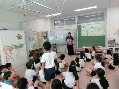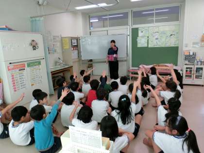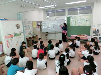 計測の3回目は4年生でした。計測のときは全学年体育着に着替え、靴下と上履きを脱いで保健室に入ります。計測前の保健指導のテーマは、「せきエチケット」でした。ウィルス感染についての話から、くしゃみや咳をするとウィルスがどれくらい飛ぶのかを紙テープで表しました。子どもたちもその距離に驚いていました。咳は手で押さえるのではなく、腕にすることの大切さを学びました。写真は1組の様子です。