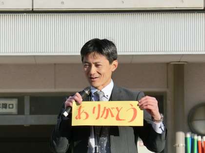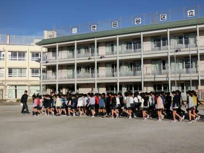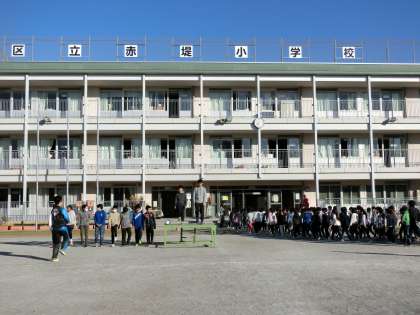 避難訓練終了後、上履きのまま防災頭巾を手に持って全校朝会を行いました。校長先生のお話は、1月の「人格の完成をめざして」のテーマ「感謝」についてでした。「ありがとう」のことばは、お礼の意味だけではなく、人と人とを結ぶ力もあるという内容でした。朝会後は、いつものように行進をして各昇降口に向かいます。6年生の当番の人が朝礼台で行進の手本を示しながら、3年生以上は校庭を1周しました。寒さが身にしみる朝でしたが、澄んだ青空のもと列に気を付けながら行進していました。