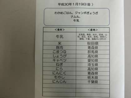 1月19日(金)の給食食材産地について