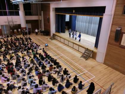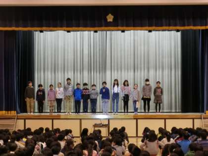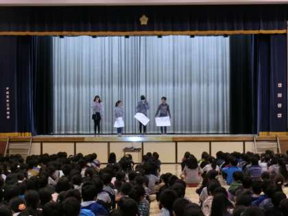 23日(火)の朝、体育館で委員会発表をしました。最初は、放送委員会でした。学校生活の中で流れる音楽をクイズにして出したり、放送委員がどのような仕事をしているかを発表したりしました。