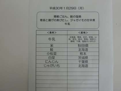 1月29日(月)の給食食材産地について