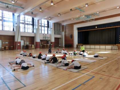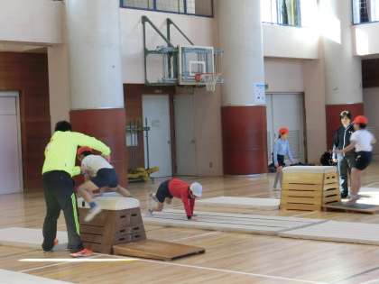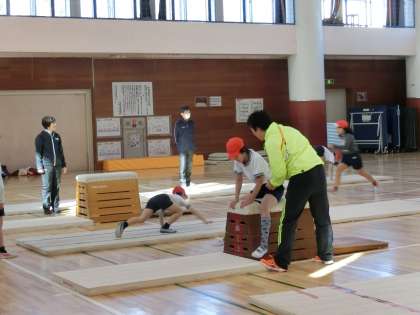 31日(水)の午前中、3年生は跳び箱教室に参加しました。講師の先生にお越しいただき、まずマット運動で体をほぐしました。その後、3段、4段、5段の跳び箱を用意して開脚跳びの練習をしました。「自分のお尻を前に運ぶ」というアドバイスを受けて、「跳べた!」と喜ぶ姿がありました。写真は、1組の様子です。