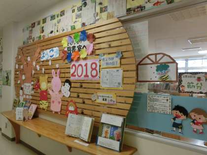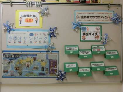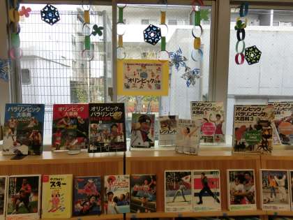 2月になりました。図書室は、装飾やテーマが変わりました。もうすぐ始まる冬季オリンピックを特集しています。室内に「オリンピックコーナー」が設けられ、各スポーツの本をたくさん紹介しています。図書室前の装飾は、豆まき姿の動物たちになりました。