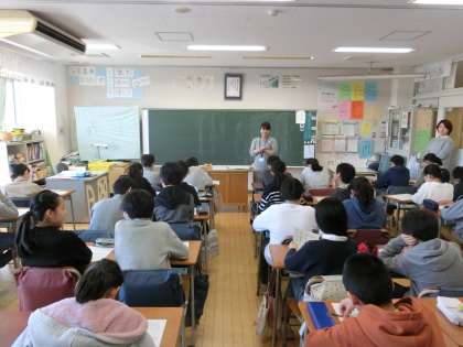 7日(水)、6年生は保健の授業がありました。今回のテーマは、「食事と栄養のバランスを考えよう」です。ゲストティーチャーとして養護教諭と栄養士が参加しました。思春期に入る6年生にとって体重は気になるものですが、「痩せるために食べないという選択肢はない。」ことを養護教諭が話しました。栄養士からは「おやつが食事になってはいけない」と話しがあり、おやつとしてよく食べられる食品のカロリーを示しました。子どもたちからは特にカロリーについての質問がありました。写真は、2組の様子です。