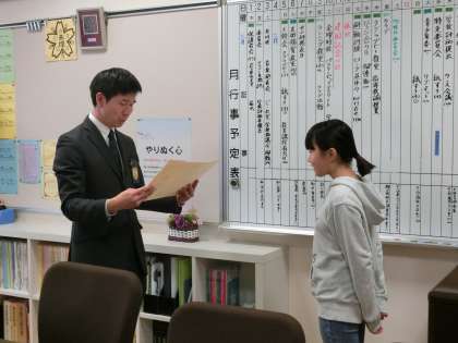 8日(木)、校長室において警察署の方から感謝状が贈られました。6年生の女子2名の勇気ある行動に対して、いただきました。次回の全校朝会で改めて表彰することになっています。
