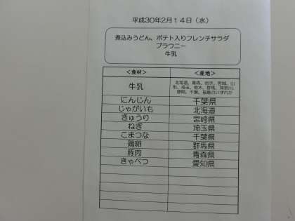 2月14日(水)の給食食材産地について
