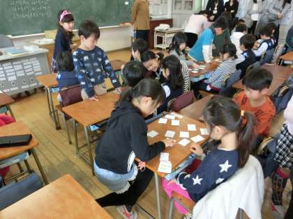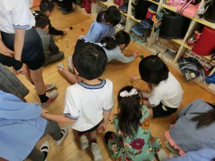 体験入学の最終日は、1組と3組で行いました。多目的室までお迎えに行き、それぞれの教室で算数の授業参観と昔遊びをしました。算数、昔遊びともに1年生はやさしく声掛けをしていました。手をつないであげる姿もすてきでした。