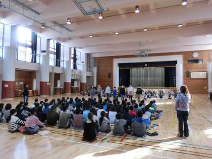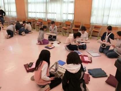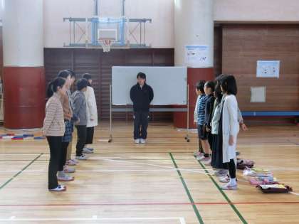 16日(金)、赤小パレードの引継ぎ式に向けた交流会が体育館で行われました。最初に6年生が「キリマンジャロ」の演奏をしました。その後、同じ楽器でペアを作り、体育館を含めた6か所に分かれて練習を行いました。