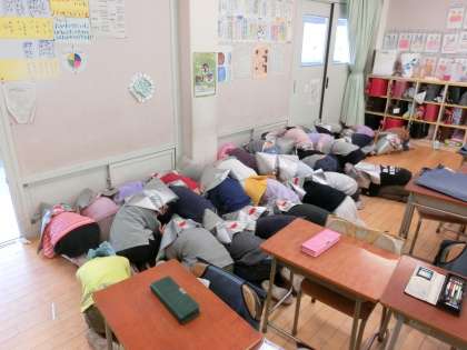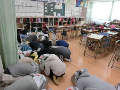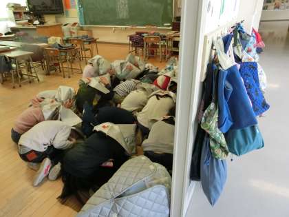 2月の避難訓練は、本校にとって初めての「Jアラート」が鳴った場合を想定して行いました。緊急放送のあと、いつもなら校庭に避難するはずが今回は教室に戻りました。防災頭巾をかぶり、窓から離れた場所でダンゴムシポーズになって自分の体を守りました。