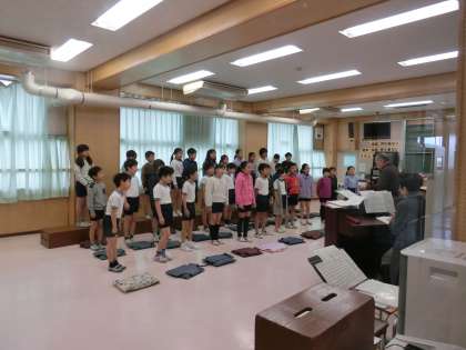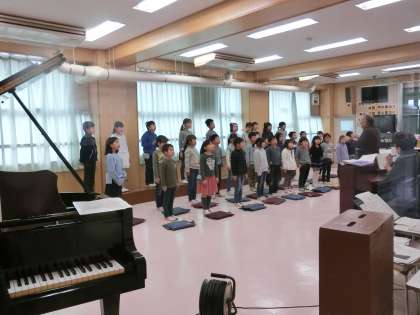 3月3日(土)に学級音楽発表会が行われます。本番に向けて、19日(月)から合唱指導の講師を招いて学級ごとの練習が始まりました。本番通り、子どもたちは3列に並び、発表する2曲の練習をします。講師の先生からは、発声のこと、息継ぎのことなど丁寧にご指導いただいています。写真は、3年1組、2年2組、1年2組の様子です。