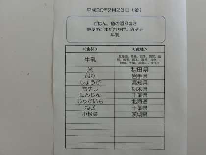 2月23日(金)の給食食材産地について