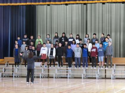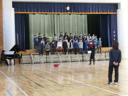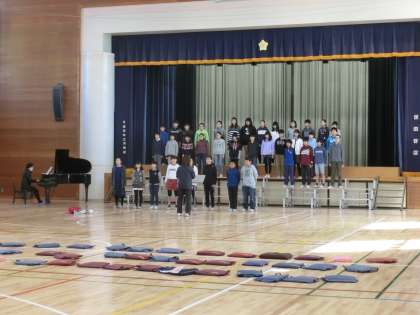 2時間目に6年1組がリハーサルを行いました。6年生のみ2曲の内の1曲を自分達で選曲しています。思いがこもっている分、声量も表現力も違います。本番がとても楽しみです。音楽の先生の指揮に合わせて歌う子どもたちの姿を目を細めて見つめる担任の先生の姿がありました。