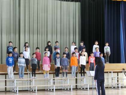 学級音楽発表会リハーサルの最後は、1年3組でした。入場と退場の練習、お辞儀の練習など歌以外の練習もしました。2曲とも歌詞をしっかり覚え、リズムも正しく刻んでいました。曲の途中にかわいらしい演出があります。