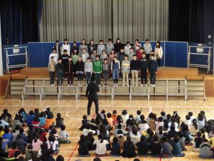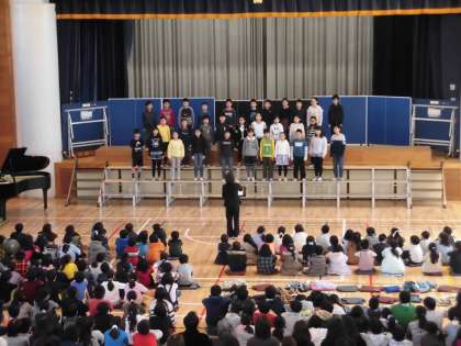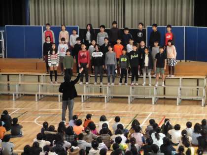 発表の前に、学級や曲目の紹介をしました。学級紹介では、自分たちのクラスの良さや楽しいところをたくさん伝えていました。写真は、4年2組「もみじ」「ゆかいに歩けば」。5年2組「冬げしき」「スキーの歌」。6年2組「栄光の架橋」「最後のチャイム」です。