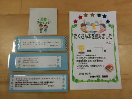 3月の図書室の紹介です。廊下の飾りには、いつもの動物たちが着飾ってひな祭りをしています。室内には、9日(土)から始まる平昌パラリンピック大会の特集が掲示されています。年度末ということから、司書のお二人が「多読賞」を作成してくれました。図書室の貸し出し冊数の多かった子どもたちが対象です。3年生以上は、各学年上位10番目までの子どもたちに、低学年は全員に贈られます。12日(月)の朝会で表彰する予定です。写真の3枚目の右側が「多読賞」です。左側のしおりは、卒業記念に6年生全員にプレゼントされます。