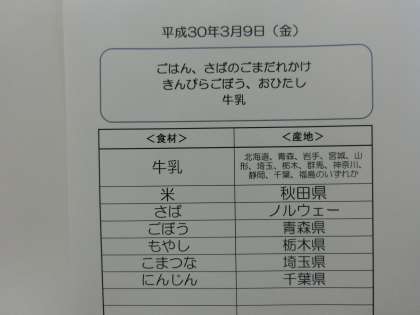 3月9日(金)の給食食材産地について