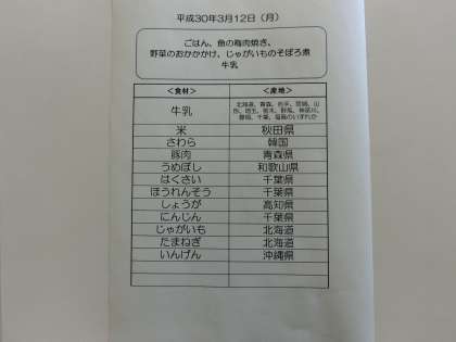 3月12日(月)の給食食材産地について
