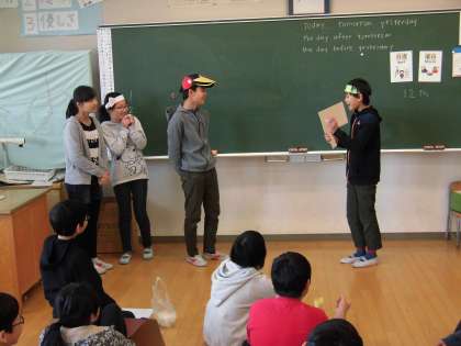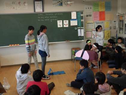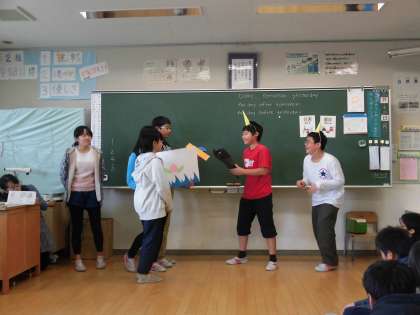 12日(月)、6年生は英語の授業のまとめとして「英語劇」に挑戦しました。演じたのは、「桃太郎」です。誰もが知っているお話ですが、英語で表現するために、子どもたちは何回も練習をしてきました。また、劇を盛り上げるために小道具も作りました。本番では、英語でのせりふも上手に言えました。写真は、2組の様子です。