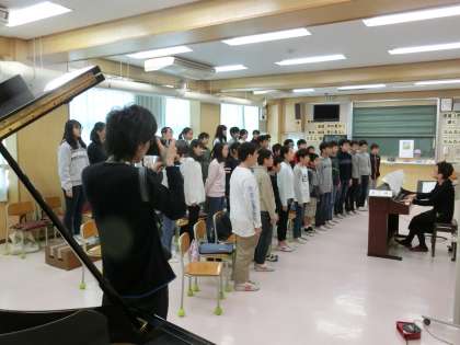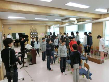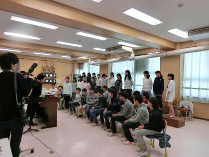 13日(火)の4時間目、音楽の授業の取材がありました。出版社から3名の方が来校し、授業の様子を写真に撮ったり、授業者にインタビューをしたりしました。今回は、時間割と授業内容から6年2組の授業でした。卒業式で歌う「最後のチャイム」と「大切なもの」の練習をしました。鼻濁音や話しかけるような歌い方などを繰り返し練習しました。シャッター音がしても動じることなく、堂々と歌う姿が立派でした。