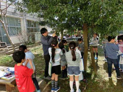 14日(水)、3年生はビオトープ周辺で理科の学習をしました。講師として動植物に詳しい専門家をお呼びしました。クラスごとに探検ボードを持って、ビオトープに集合しました。最初に「生き物ビンゴ」をしました。「よく見るとこんなにあるんだな。」と嬉しい発見をたくさんしました。さらに、葉を丸めて笛のように鳴らしたり、双眼顕微鏡で拡大して観察したりしました。写真は、2時間目の1組の様子です。