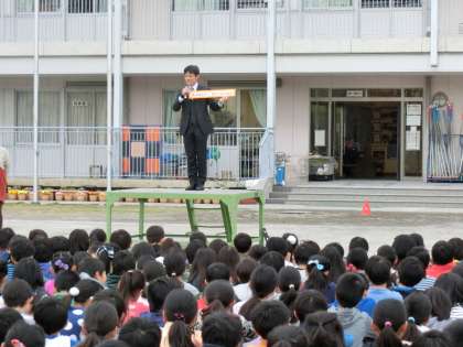 19日(月)、曇り空の下ではありましたが、校庭で今年度最後の全校朝会を行いました。あいさつのあとは、6年生による最後のスピーチでした。毎回、全校児童の前に立ち、今取り組んでいることの話をしたり、最上級生としての思いを伝えたりしてきました。6年生の話を静かに聞くことができ、話を終えると拍手が沸き起こるというすてきな時間を1年間続けてきました。朝会後の行進は、最後ということもあってどの学年も上手にできました。
