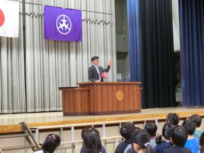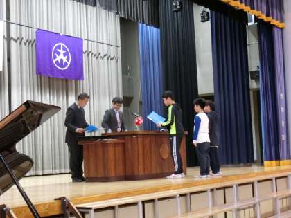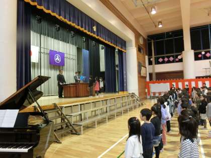 22日(木)、今年度の修了式を体育館で行いました。最初に修了証書の授与をしました。各学級から代表が1名出て、校長先生から受け取りました。学年ごとに行いましたが、名前を呼ばれると大きな声で返事ができました。その後、校長先生のお話がありました。話の内容は、「あきらめない、工夫すること、チームの中で自分を生かすこと」の大切さについてでした。写真の1枚目と2枚目は、1年生と5年生の様子です。