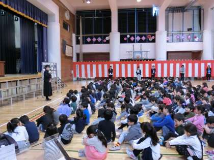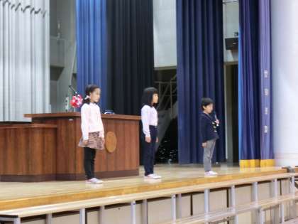 校長先生のお話の中に、今年度の皆勤賞の発表がありました。全校児童のうち、119名が皆勤賞となりました。1年生から順に名前を呼ばれ、その場に立ちました。代表して6年生が校長先生から賞を受け取りました。児童の言葉は、1年生でした。原稿を暗記して、ゆっくり大きな声で話をしました。図画工作が好きになったこと、算数の計算が得意になったこと、給食を残さずに食べられるようになったこと、3人の言葉を上級生みんながしっかりと聞いていました。修了式後の第2部では、春休みの生活についての話をしました。子どもたちに守ってほしい「は・ひ・ふ・へ・ほ」の確認をしました。